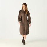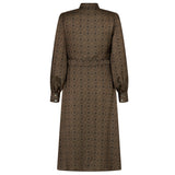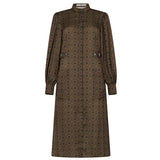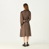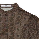 Wear a bit of our history with our interlocking D shirt dress. It has been designed with our self-supported waistband details like our DAKS original trouser. A classic shirt style dress with a button down fastening of grey shell made in Spain buttons, featuring a concealed plaquet, grandad collar and long gathered sleeves with generous long cuffs. It sits at mid length which allows for an easy wearing silhouette. Covered in the interlocking D design created by our in-house print team at our design studio in London making it a classic DAKS look. The fabric is printed in Italy and the dress is made in the UK.