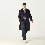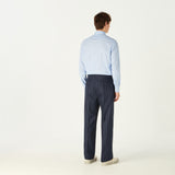 A smart casual statement wide leg trouser inspired by a DAKS archive trouser with the classic DAKS top waist adjusters, half lined front leg for flexibility and four inverted pleats, making this piece the perfect go to for a variety of occasions. A longer rise for comfortability and a back jet pocket with button fastening detail. The navy stripe British cotton wool blend fabric is made at Moons in Yorkshire, and the trouser is made in Italy ensuring the utmost quality and the best of tailoring.