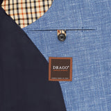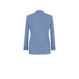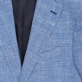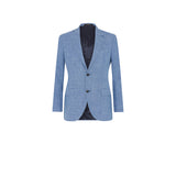 A lovely combination of summer blue hues, this jacket is made from a silk blend, as seen through the white yarns in the cloth. This cloth is also combined with linen and cotton giving the jacket a textured appearance. This is a classic single-breasted jacket with 8cm notch lapels, two-button fastening and straight front flap pockets