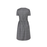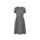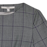 This is a short sleeveless woolen tunic dress in grey and purple grid check. This dress features a round neck collar and a decorative belting detail around the mid drift, with the hem sitting just below the knee.