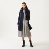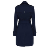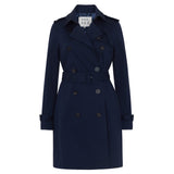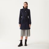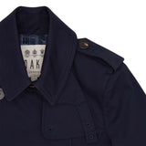 This is a modern interpretation of the classic double breasted trench coat in navy blue. Inspired by the DAKS archives, this coat references a classic silhouette and includes signature detailing such as buckled waist and cuffs, hook-and-eye collar closure and double-breasted buttons.