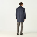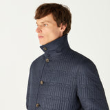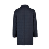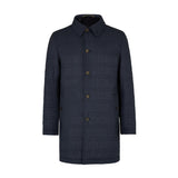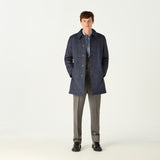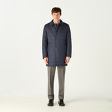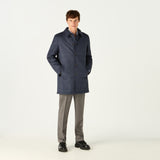 Layer up in warmth without weight in our stylish navy mac, featuring our exclusive DAKS iconic D chain logo print throughout. Made in Italy, this high collared mac with DAKS branded eco horn button fastening, welt side pockets and internal zip pocket, this outerwear piece provides practicality combined with smart quilting and will protect you in inclement weather for a sophisticated look.